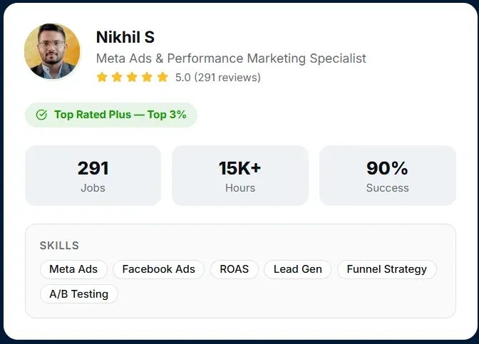 10+ years of performance marketing experience across industries, with over $15M in managed ad spend and 291+ completed Upwork projects. I've consistently maintained Top Rated Plus status with a 90% job success score.